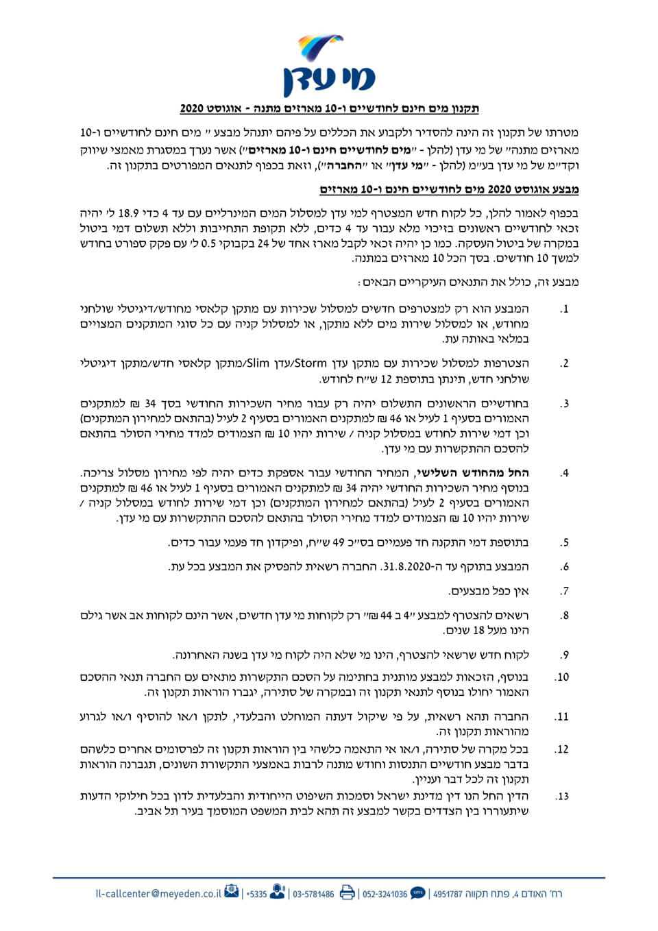 פתוח למצטרפים חדשים או ללקוחות חוזרים שעברו 18 חודשים ממועד התנתקותם. ההטבה פתוחה למצטרפים במסלול צריכה של 3 כדי 18.9 ל' בחודש. הטבת ההצטרפות כוללת זיכוי למשך 3 חודשים, וכן ארגז כוסות קר+1 שישיה של ליטר וחצי+ 2 מארזי 0.5 ליטר במתנה! דמי התקנה חד פעמיים בסך 49 ₪. בכפוף לתנאי ההצטרפות. חודש משמעו אספקת כדים אחת ל-28 יום.